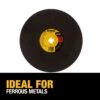 The DEWALT high performance metal grinding wheel is a professional solution for a range of grinding applications. The grinding wheel is made with tested high performance aluminum oxide for long life and high material removal and full sheets of fiberglass for durability and safety. DEWALT® developed a proprietary material mix to maximize the wheel’s lifespan and help you minimize tool replacement costs. With a high grain concentration, you are assured of aggressive grinding action and smoother running wheels, no matter what the job.