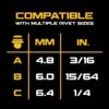 Compatible with multiple size rivets including 3/16″, 15/64″, and 1/4″ rivets