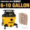 This DEWALT standard disposable filter bag fits any of the DEWALT 6 to 10 Gallon wet/dry vacs. The filter bag can be easily installed to the inside of any of the 6 to 10 Gallon vacuum tanks.