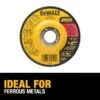 The DEWALT high performance metal grinding wheel is a professional solution for a range of grinding applications. The grinding wheel is made with high performance aluminum oxide for long life and high material removal and 3 full sheets of fiberglass for durability and safety. DEWALT® developed a proprietary material mix to maximize the wheel’s lifespan and help you minimize tool replacement costs. With a high grain concentration, you are assured of aggressive grinding action and smoother running wheels, no matter what the job.