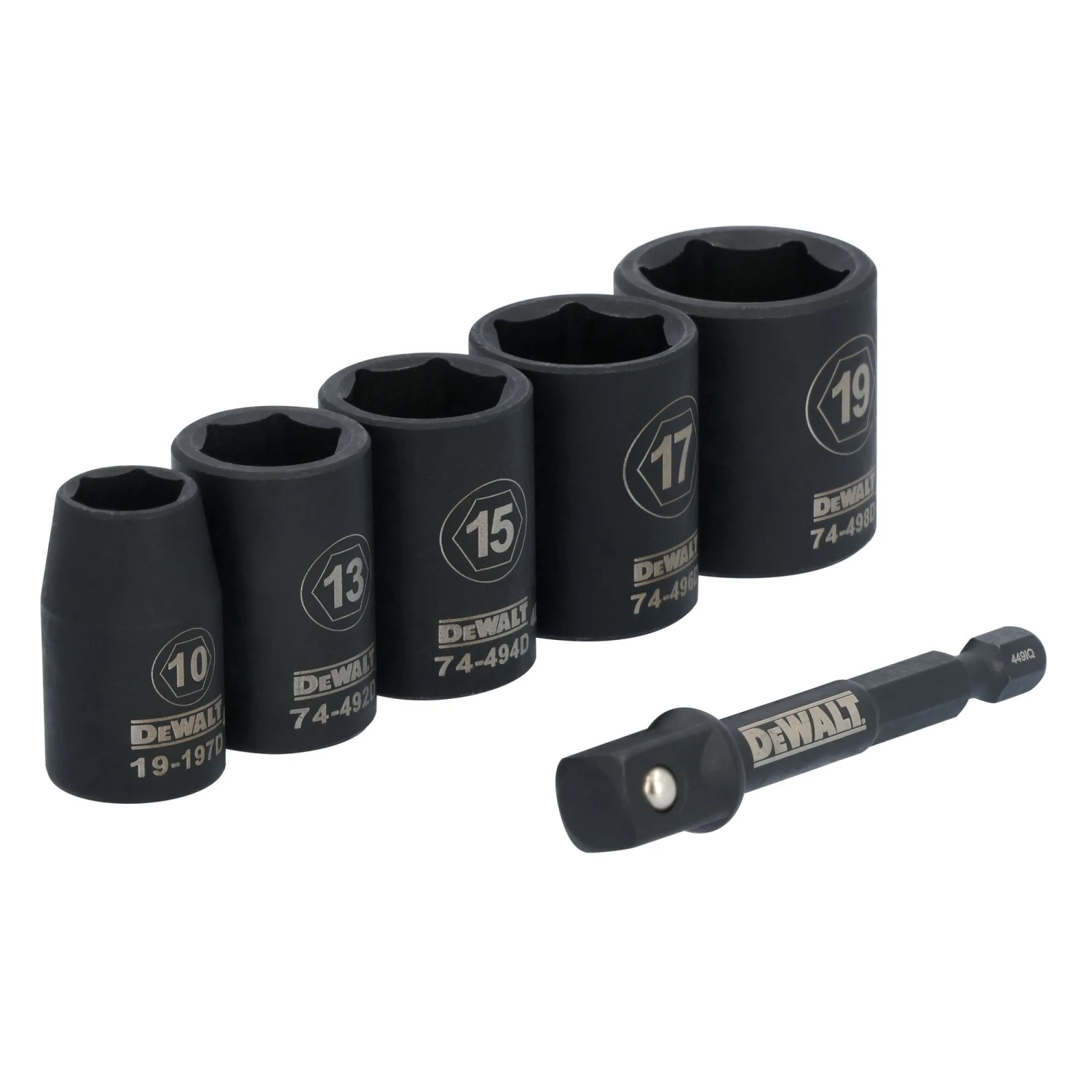 The DEWALT® 3/8-in drive socket set includes the five most common size Metric sockets and one 1/4-in adapter. These sockets are made of high impact resistant material for durability, and have recessed corners that distribute torque across flats, promoting life of the socket. The sockets also feature large laser etched markings that make each socket easily identifiable, and are thinner than pneumatic wrench sockets for tough to access areas.