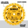 Power through a variety of materials with this redesigned 7-1/4 in. 24T Circular Saw Blade that features cutting-edge engineering for up to 2X the life*. Redesigned with proprietary heat-vents and a PTFE coating, this blade helps limit binding and dissipates heat for smooth performance in a wide range of applications. From framing to carpentry, this state-of-the art DEWALT® 7-1/4 in. 24T Circular Saw Blade cuts through tough jobs with ease.