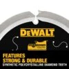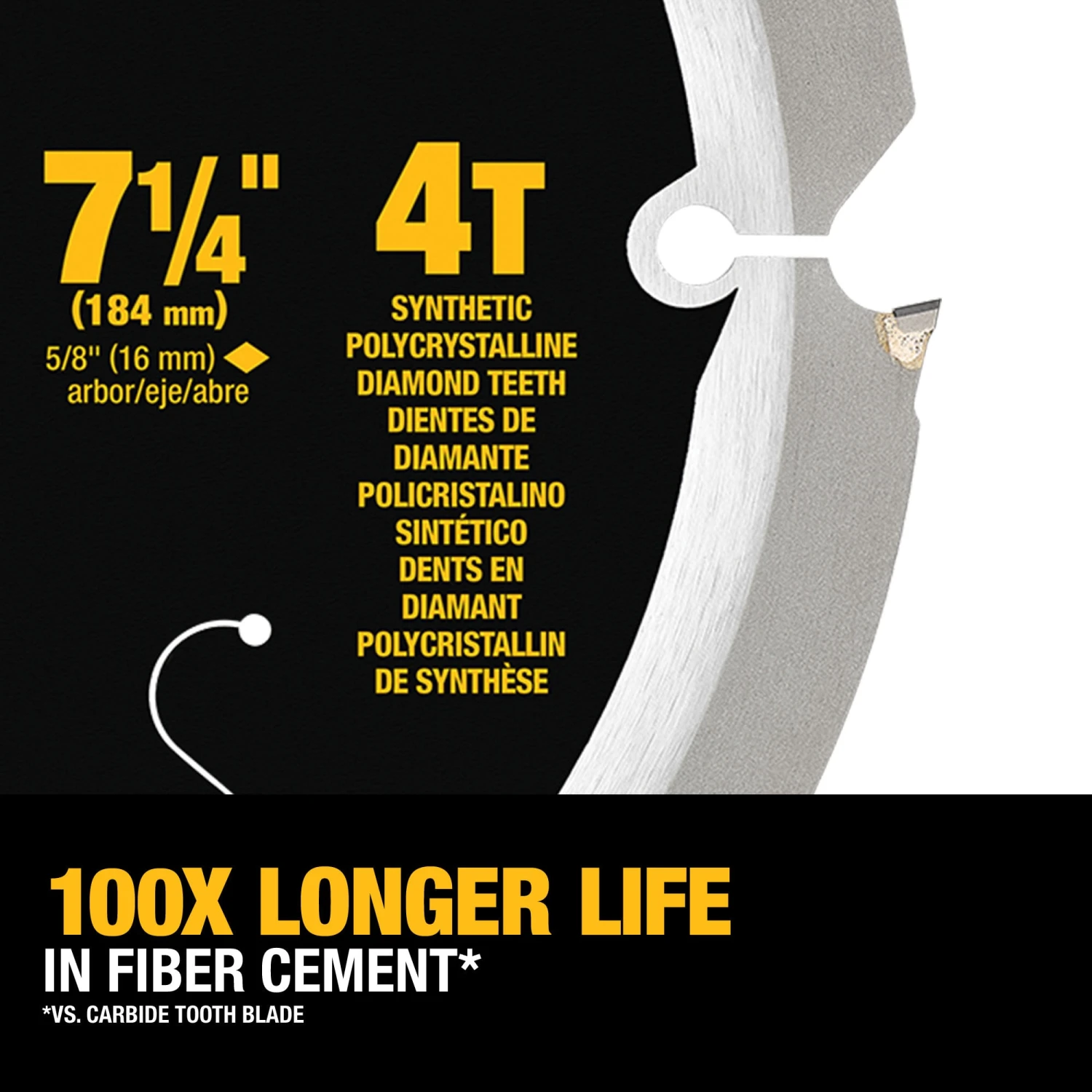 The DEWALT 7-1/4-in diamond circular saw blade features synthetic polycrystalline diamond teeth for smoother, sharper cuts. This 4-tooth circular saw blade is designed for use on fiber cement boards and laminate/prefinished flooring. Other applications include laminate and pre-fabricated flooring installation. This DEWALT circular saw blade lives up to the brand’s reputation for durability and strong performance. The blade is thick enough for multiple uses but thin enough to remain sharp after many cutting jobs. It provides fast, precise cuts for your home remodeling projects, DIY projects, and other applications. Shop this 4-tooth circular saw blade and other DEWALT tools and accessories today.