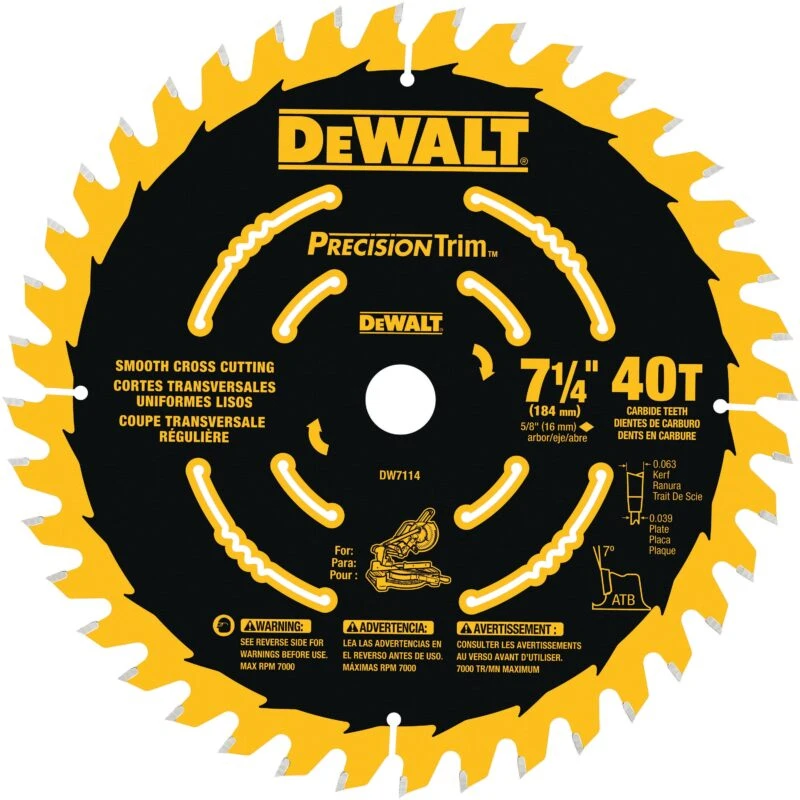 The DEWALT Precision Trim 7-1/4-inch 40-tooth carbide miter saw blade is designed to be used with the DEWALT cordless miter saw. Together, this tool combination slices through plywood, softwood (fir, spruce, redwood, pine, cedar, etc.), and hardwood (cherry, oak, walnut, maple, mahogany, etc.) for construction and home improvement-related projects, like cabinetry, joinery, furniture, framework, and more. This general purpose blade has optimized hook angles that cut through wood with ease, and its ultra-sharp carbide teeth make the work frustration-free. It prevents gumming up and reduces tear-out on the material. It leaves behind a fine woodcut finish and is suitable for dry cutting. Shop this 7-1/4-inch 40-tooth carbide miter saw blade for your workshop at Lowes.com today.