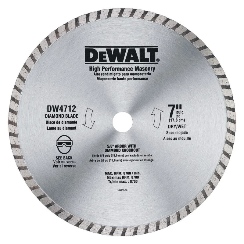 The DEWALT® 7-in x 5/8-in high performance diamond masonry blade has been thoroughly tested to ensure that its diamond matrix provides 200 times the life of conventional abrasives. Enhanced material removal and a faster cut rate at a constant depth allow you to increase efficiency on important jobs. With a thin kerf, this blade increases speed while minimizing dust, so you never have to sacrifice speed for cleanliness. These proven features allow you to work with confidence, knowing that the DEWALT® high performance diamond masonry blade is the right tool for use with thinner and softer masonry materials.