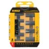 The DEWALT® 3/8-in drive socket set includes the eight most common size SAE sockets and one 1/4-in adapter. These sockets are made of high impact resistant material for durability, and have recessed corners that distribute torque across flats, promoting life of the socket. The sockets also feature large laser etched markings that make each socket easily identifiable, and are thinner than pneumatic wrench sockets for tough to access areas.