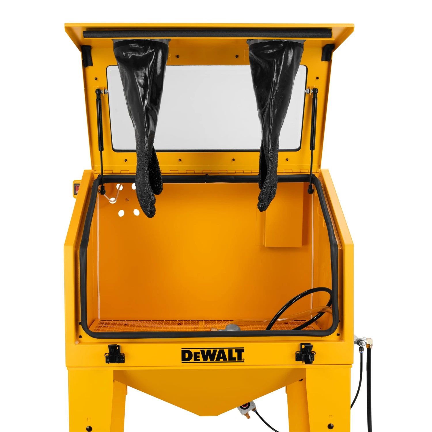 Large hood-style door with gas filled lift springs for maximum access to work space.