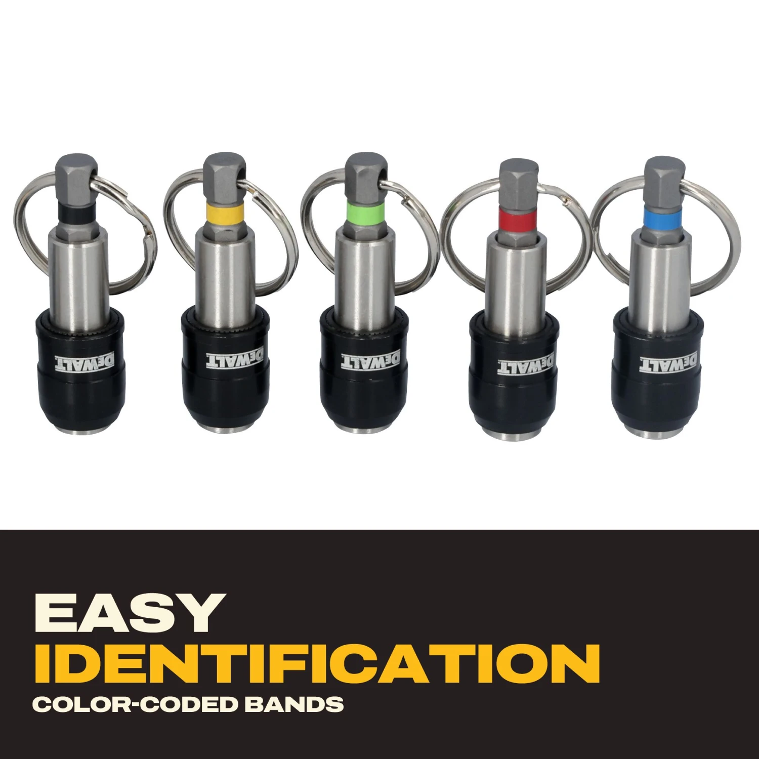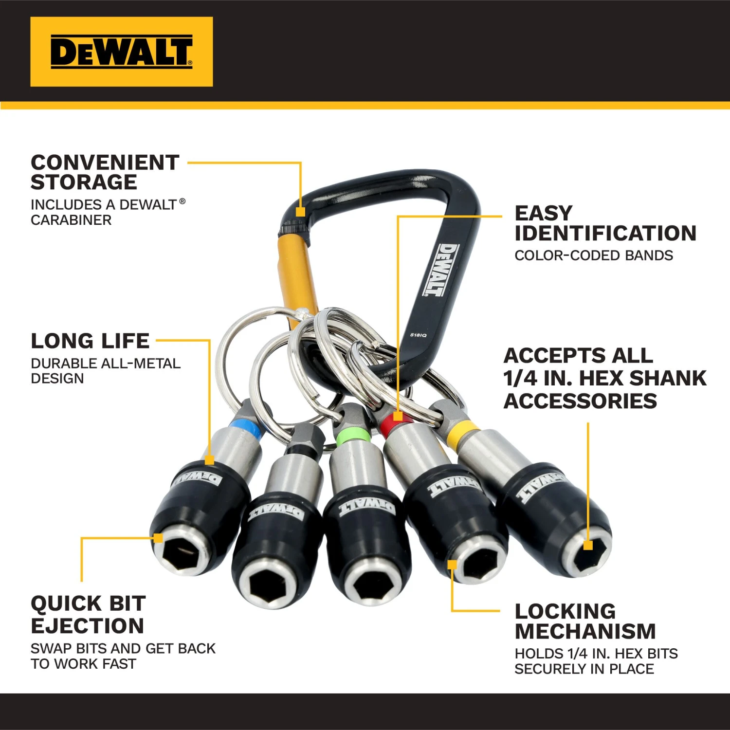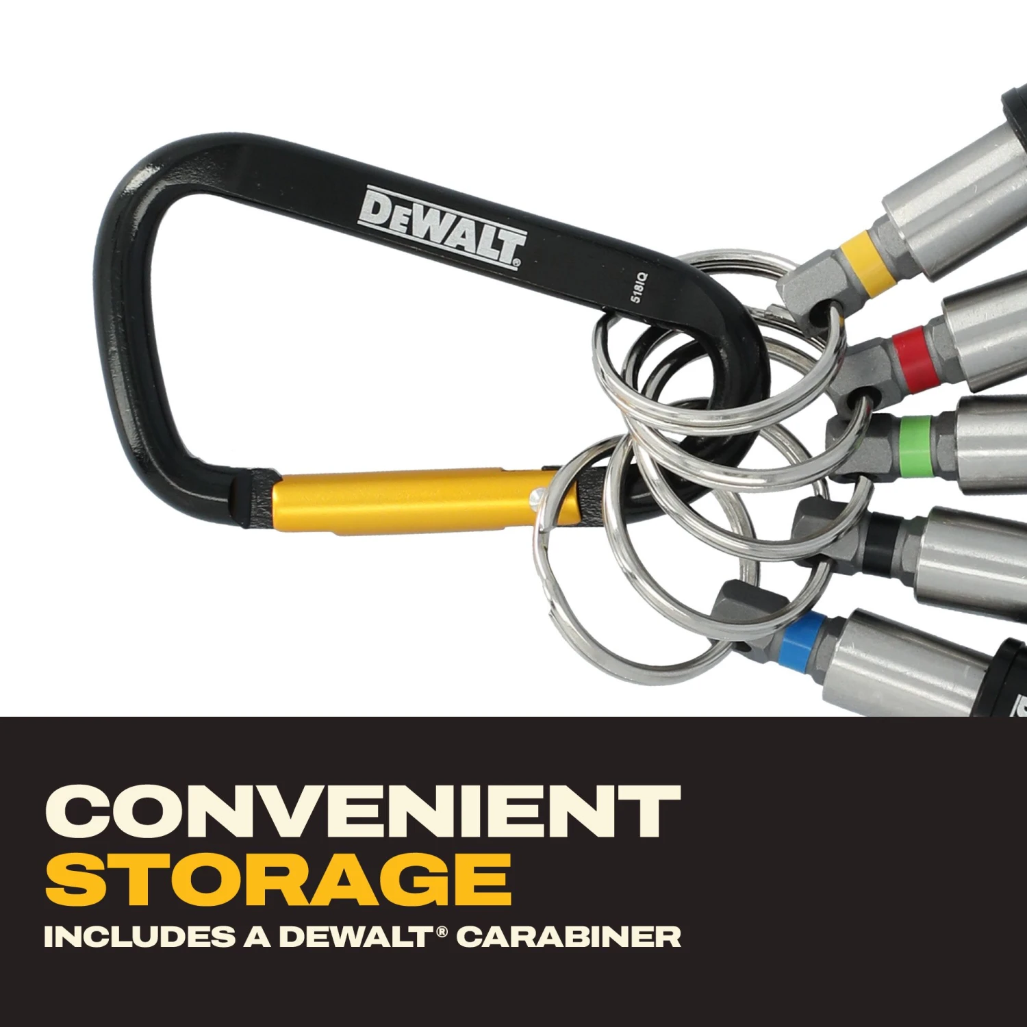 Keep essential bits close-at-hand with the DEWALT Keyring Bit Holder Set. Color-coded organization allows you to find the right bit fast and the DEWALT carabiner conveniently stores them on a tool belt. Featuring a locking design to hold bits in place and quick bit ejection, the DEWALT Keyring Bit Holder Set helps you get back to work fast.
