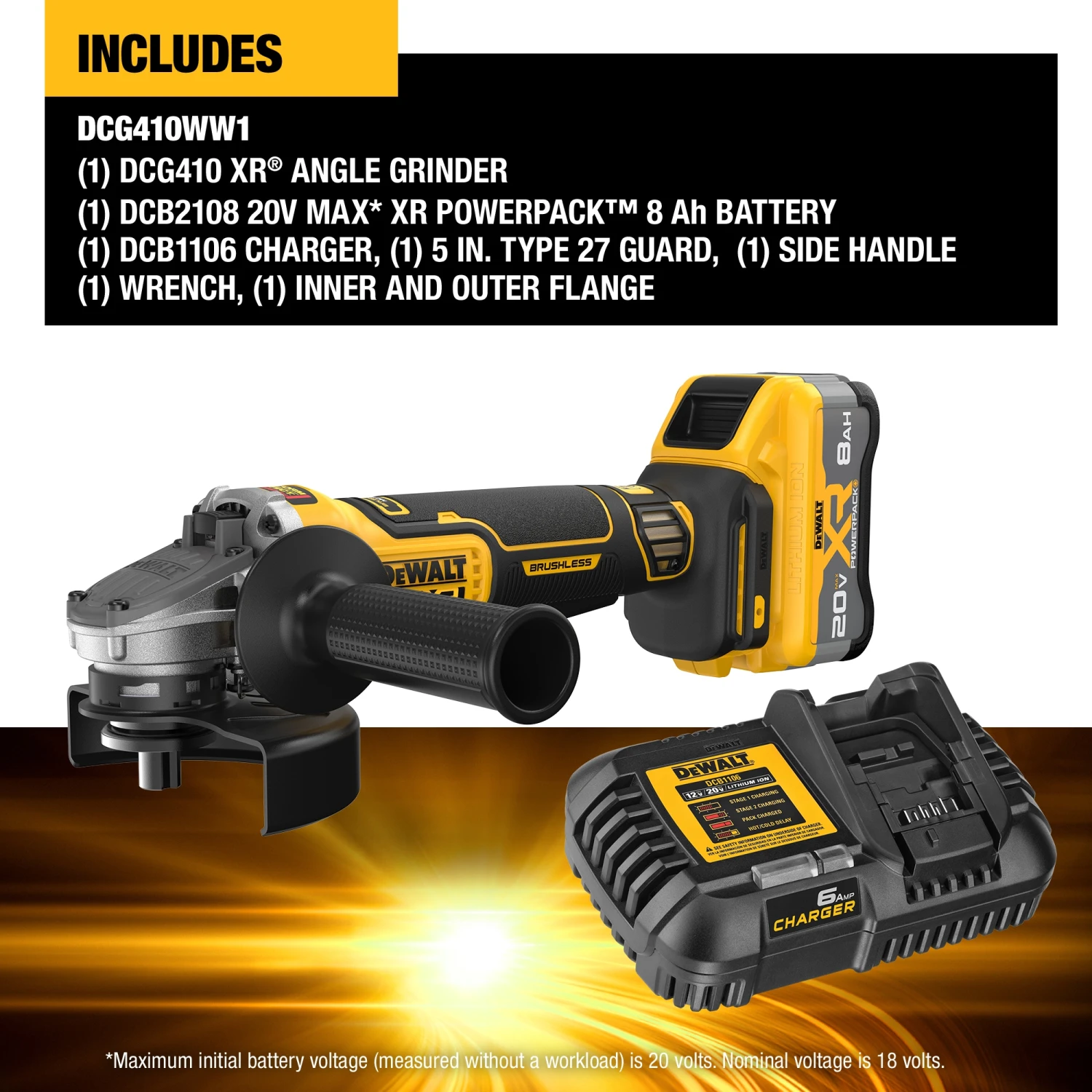 | Package Contents | DCG410 XR Angle Grinder, DCB2108 XR POWERPACK 8 Ah Battery, 5-in (125 mm) Type 27 Guard, Fast Charger, Side Handle, Wrench, Inner and Outer Flange |
